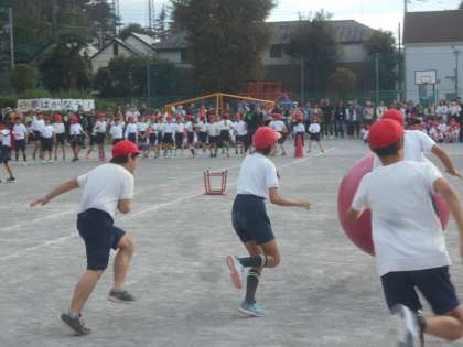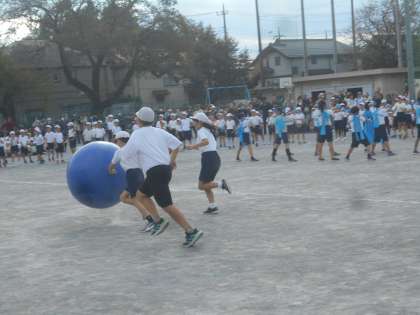 力強い応援合戦が終わって、 いよいよ最終種目 「心を一つに大玉送り」 です。 これは、 1,3,5年と2.4.6年の 2回に分けてそれぞれに勝敗を競いました。 玉を送ろうと力が入りすぎてコースアウトの場面が何度かあり、 勝負の行方が最後まで読めないドキドキの展開でした。 今回のテーマ、 「最後まで 心ひとつに 限界突破!!」 まさにそのテーマである「心をひとつに!」頑張った大玉送りでした! 最後まで力を尽くして戦ったみなさん! 本当にお疲れさまでした!!