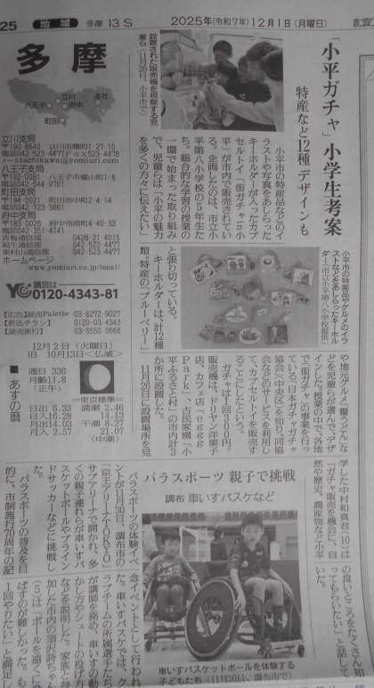 今日から12月です。 今朝は、全校朝会で、先週の火曜日に販売が開始された「街ガチャin小平」のアピールを5年生が行いました。 より多くの人に小平の魅力を知ってほしいと、 自分たちが、このガチャに込めた思いを語りました。 そして、この取組は早速本日付け(12月1日)の読売新聞の多摩版にも掲載されました。