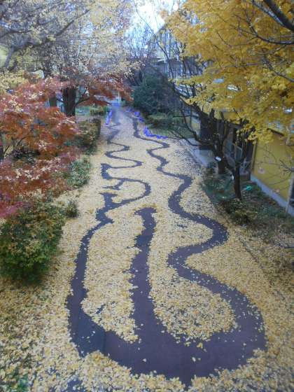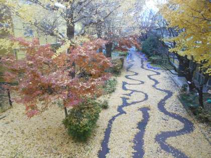 先週も中庭の紅葉記事をお届けしましたが、 それにもまして、今落ち葉が素晴らしいです。 散り敷いた銀杏の葉の中に、 だれが作ったのでしょう、道ができていました。