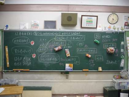 国語ではお話づくりを楽しく行うこどもたちの姿、算数では箱の形に着目して仲間分けする姿や2つの方法でひき算のやり方を考える姿が見られました。教科学習に応じて、こどもたち一人一人が夢に向かっていたと捉えています。1年生段階で、多くの人たちが見ている場での授業を経験できたことは大きな成長につながると考えています。頑張ったこどもたちは、本当に素晴らしかったです。 ※写真は、1年2組の最後の黒板です。