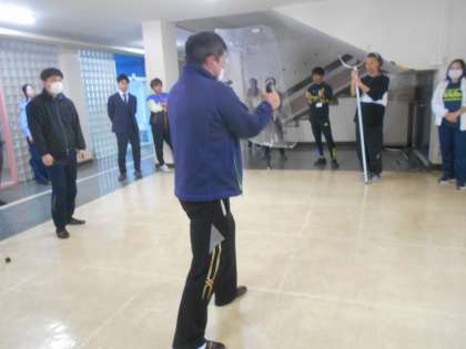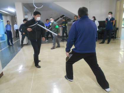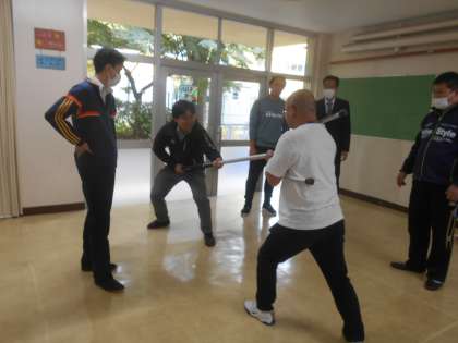昨年の立川で起きた、侵入者による教師への暴行事件はまだ記憶に新しいところです。 これまでの不審者のイメージは、平成13年の大阪府の池田小事件など、 単独犯のイメージが強かったのですが、立川の事件は複数でした。 安全であるべき学校に侵入して、児童や教職員に危害を及ぼすという異常な行動は、 その異常さから「複数」という発想に繋がらなかったとも考えられます。 この日の訓練では、刃物をもった不審者が、玄関から校舎内に侵入したという想定で行われました。訓練の中では、駆け付けた教員によって数分で制圧されたことになりましたが、児童の安全は言うまでもないですが、教職員の無事・安全も大切なことです。 そのためにも、杈(さすまた)や盾(たて)の効果的な使い方について、小平警察の方に実地で研修をしていただきました。