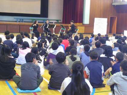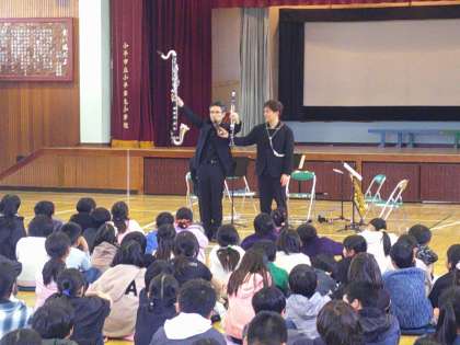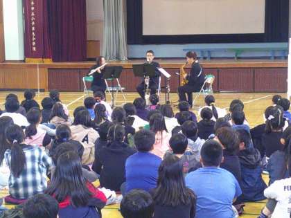 フルート、クラリネット、サックスによる演奏で、楽器の紹介などもありました。児童たちはきれいな生の音楽に聞き入っていました。