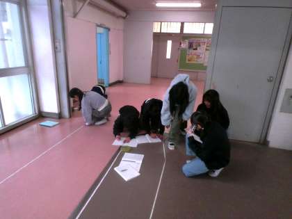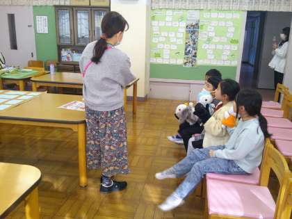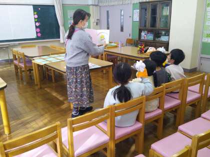 まず、10歩で歩いた長さを3回測ります。次に、3回の平均を出します。そして、1歩あたりの長さを求めました。 すでに校門から家までの歩数を調べてきたこどももいて、「計算したら、900mになりました」「毎日およそ2km歩いているんだ」という声がありました。 11月6日(木)お話会を行いました。