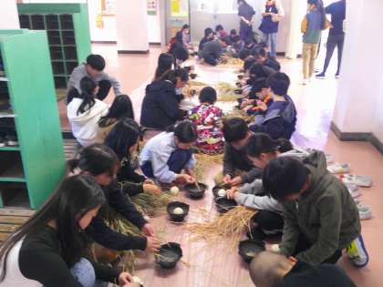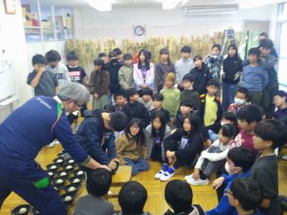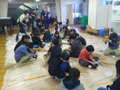 初めにやり方を教わり、代表の児童が行う様子を見た後、みんなで作業に取り掛かりました。手指での脱穀、すり鉢と野球のボールでの籾摺りでしたが、皆熱心に作業してたくさんの玄米が出来上がりました。