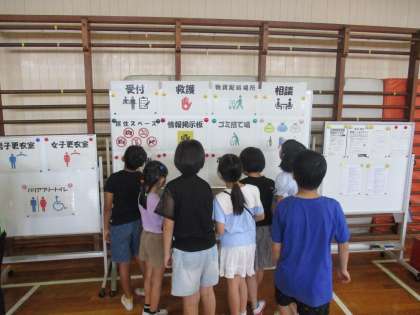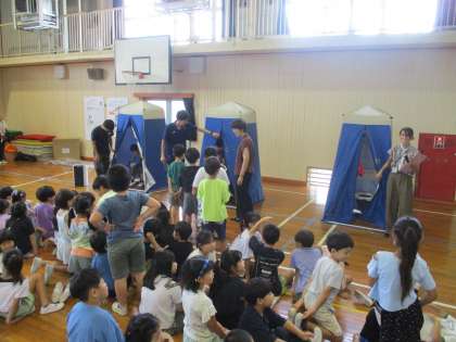 今日は2学期始めの土曜公開日ですが、この日を鈴木小では「防災を考える日」にしています。学校経営協議会をはじめ各関係機関のお力添えをいただき、体育館でマンホールトイレや避難袋、防災グッズや避難所の表示などを見学します。また、すべての学級で防災に関する授業も行い、災害が発生したときに私たちはどうすればよいのかを学びます。