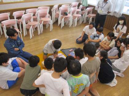 鈴木小「防災を考える日」に、消防署の方をお招きして、5・6年生の子どもたちが心肺蘇生及びAED体験をしました。現在、AEDは公共機関や駅、デパートなど、人が集まる多くの場所に設置されています。命に関わる大切な授業です。消防士から説明を受けた後、電話をする役、AEDを持ってくる役などに分かれ、マネキンを使って実際に人命救助の体験をしました。消防士の指導のもと、子どもたちは真剣な表情で体験に臨んでいました。
