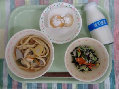 今年の十五夜(中秋の名月)は、10月6日です。そこで、今日の給食は「お月見メニュー」にしました。お月見うどんには月の中にはうさぎが描かれたかまぼこを浮かべました。また、かぼちゃを練りこんで、月をイメージした黄色と白の二色の月見団子を作りました。