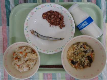 牛乳 鶏ごぼうごはん 焼きししゃも 丸ごとわかめ汁 ココア豆 10月に2年生が道徳で「かむかむメニュー」を学習しました。この単元では、よくかむことの大切さを学びます。 今日の給食は、この単元にちなんでかむかむメニューにしました。「ココア豆」は新メニューで、煎り大豆を使って作ります。 |