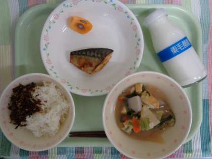 牛乳 ごはん エコふりかけ さばの塩焼き 野菜と里芋のみそ汁 くだもの(柿) 今月は「食品ロス削減月間」で、10月30日は「食品ロス削減の日」となっています。 今日の給食の「エコふりかけ」は食品ロス削減メニューで、普段は捨ててしまっているだしをとった昆布とかつお節のだしがらを、ふりかけに変身させました。今月は食品ロス削減について、声かけをすることが多かったのですが、それが児童に届いたのか、給食委員会や3年生の係・会社活動で食品ロス削減について取り組みを始めてくれる児童がでてきました。児童の今後の活動に期待しています! 10月28日の給食<かむかむメニュー>
