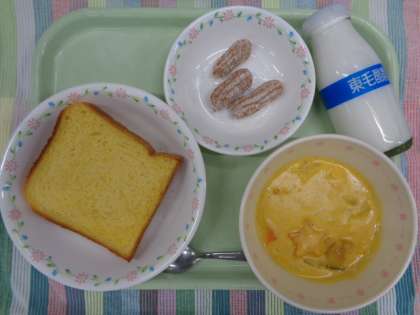 牛乳 パンプキンパン かぼちゃのシチュー ひとくちチュロス 今日の給食はハロウィン献立です。かぼちゃのシチューの中には、調理員さんが各クラスに1つずつ星形にしたにんじん“ラッキースター”を入れてくれました。 デザートのチュロスは、鈴木小ではリクエストメニューに常連の人気メニューです。今日のチュロスはひとくちサイズで作ってみました。 10月30日の給食<食品ロス削減の日>